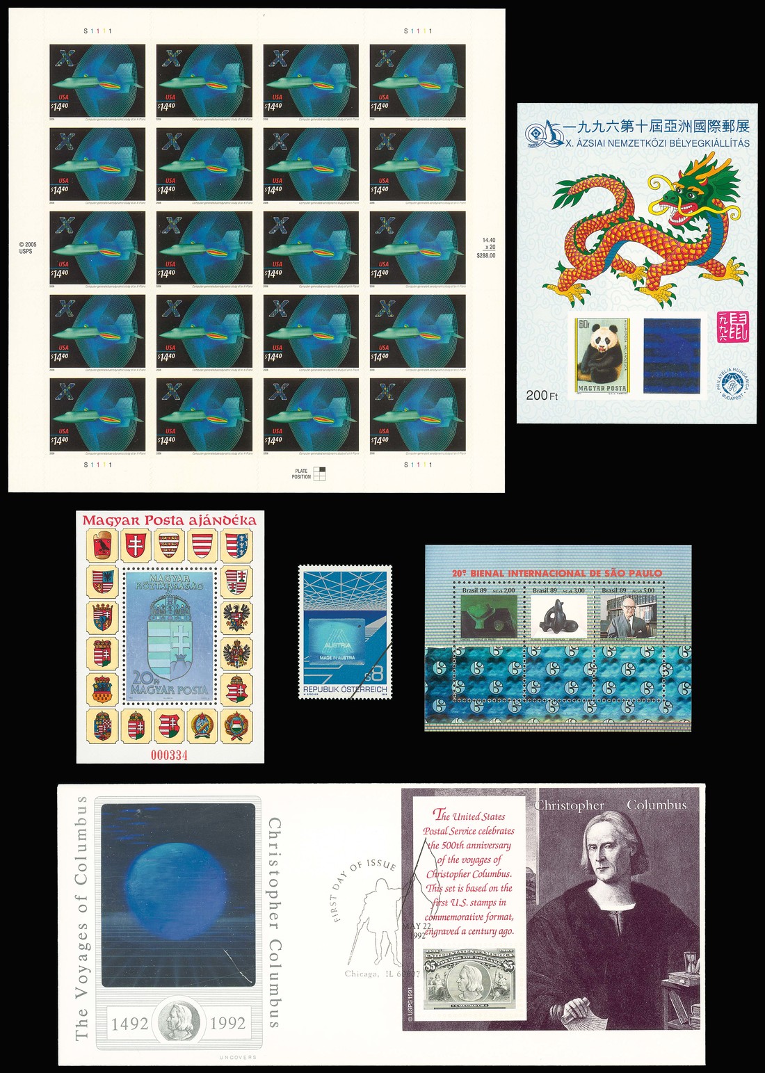 1988-2012 Holograms, the definitive collection, housed in ten large stockbooks and loose, contained in three cartons, arranged chronologically and including 1989 United States 25c. envelope with missing hologram, 1990 United States O.J. Simpson first day cover, 1991 Hungary New Coat of Arms 20f. miniature sheet with "Magyar Posta ajándéka" overprint, 1991 Poland Phila Nippon misplaced hologram miniature sheets, 1992 Finland Technology set in sheets of fifteen, United States Columbus miniature sheets, Canada Space errors (13), China Frescos, Germany Newton sheet of fifteen, 1994 Guyana Elvis Presley silver $300 miniature sheet, gold $300 single and first day cover, Isle of Man £5 sheets of ten, Plates 1A and 1B, Tonga Tongastar 1 booklet overprinted "specimen", 1995 United States 32c. Space Station envelopes (3), 32c. envelopes with hologram error, 1996 Hungary Asiatic Exhibition black miniature sheet, Thailand 1996 Jubilee sheet, 1998 Indonesia Ducks and Geese misplaced holograms, 1999 Hungary Solar Eclipse sheet used and on first day cover, France Stamp Anniversary sheet of 25, Canada Millennium uncut Press sheet, China Ethnic Folk Groups two album set, 2000 Australia Canberra stamp show personalised sheet, United States Space Achievement uncut press sheet, 2006 United States X Plane $4.05 and $14.40 sheets of twenty, 2007 Australia Blast Off prestige booklet, Thailand King's birthday imperforate miniature sheet, 2008 Austria Football (crystal) miniature sheet, Romania Gopo Arts special folder, 2009 Romamia Polar Regions miniature sheet, Australia overprinted Castle miniature sheet, 2012 Jersey Diamond Jubilee £10 miniature sheet and commemorative folder with £100 note, Thailand King and Queen's birthday folder, Australia Road Trip folder, etc., fine. A valuable and fascinating lot, probably the most comprehensive collection of these issues formed. A complete list is available on request. Also included is "Holography and Philately, Postage Stamps with Holograms" by Hans J. Bjelkhagen. Photo