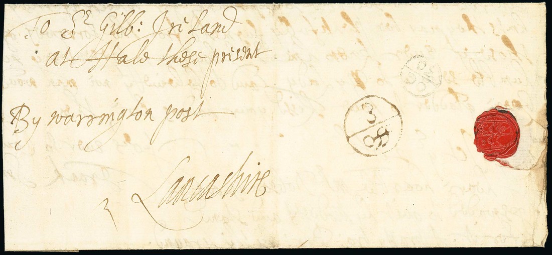 1670 (29 Oct.) entire letter addressed to "Sir Gilbert Ireland/By Warrington Post/Lancashire", on reverse, and opening well for display, a fine upright strike of the very rare "3/Off"(ice) handstamp and light "oc/30" Bishop marking; believed to be the finest known example of this marking. Photo