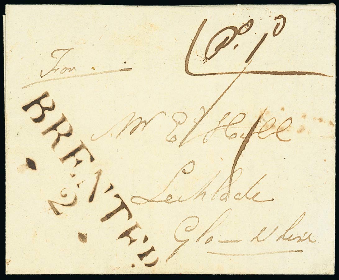 1794 (5 Dec.) entire letter to Gloucestershire, endorsed "Pd 1d" and with superb "BRENTFd/-2-" experimental receiving house handstamp in black. Wonderful quality. Photo