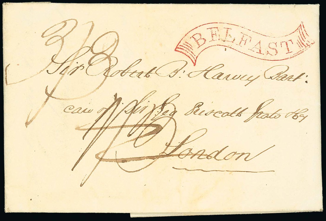 1801 (8 April) entire letter to London with a superb and upright strike of the distinctive "belfast" in scroll with shading at the ends in red and "s/apr 12/1801" datestamp in the same colour on reverse; complete, cracked red wax seal of a female head. A stunning entire. Photo