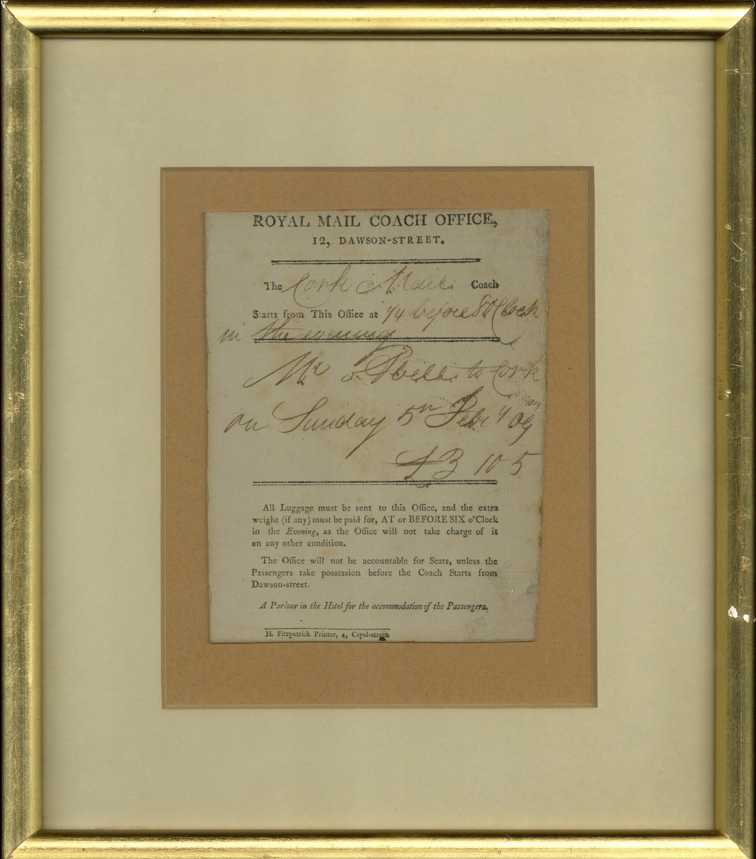 1809 (5 Feb.) "royal mail coach office/12, dawson-street" ticket for the Cork mail coach (133x162mm), 1836 (20 Jan.) "royal mail coach office/pembroke street." ticket for the Dublin mail coach (111x190mm), both mounted on card and framed; also two prints depicting "Bordoyle Bridge/Dublin & Drogheda Railway" and The Louth Mail Snowed Up, 1836", both mounted and framed. An interesting group housed in a carton