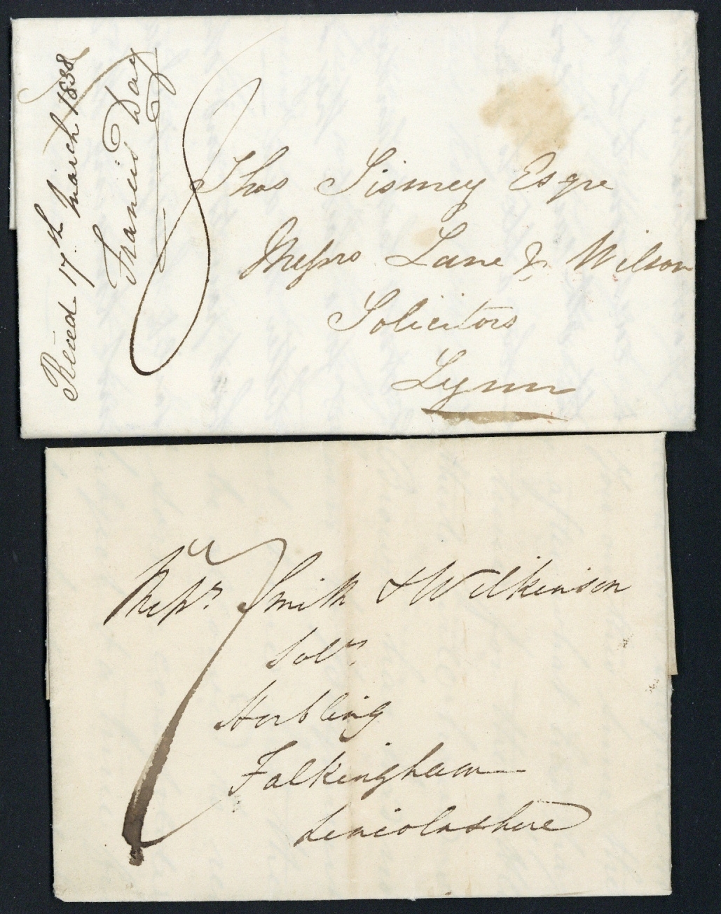 1830 (1 Jan.) entire letter to Falkingham, on reverse superb red undated double ring "st. noets" (sic), also 1838 (16 March) entire letter to Lynn with fine red undated double ring "st. neots" on reverse; a fine pair and accompanied by a contemporary coloured map of Huntingdon