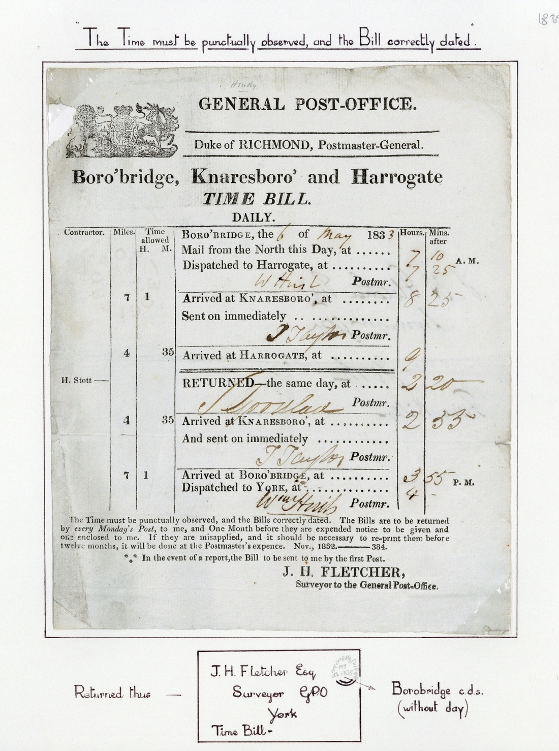 1833 (May) General Post Office "Time Bill" printed circular from the Duke of Richmond Postmaster-General, completed and being returned from Borobridge to J.H. Fletcher, Surveyor of the General Post Office in York, despatch c.d.s. on face; instructions include "The Time must be punctually observed, and the Bills correctly dated"; small fault at one corner. Unusual