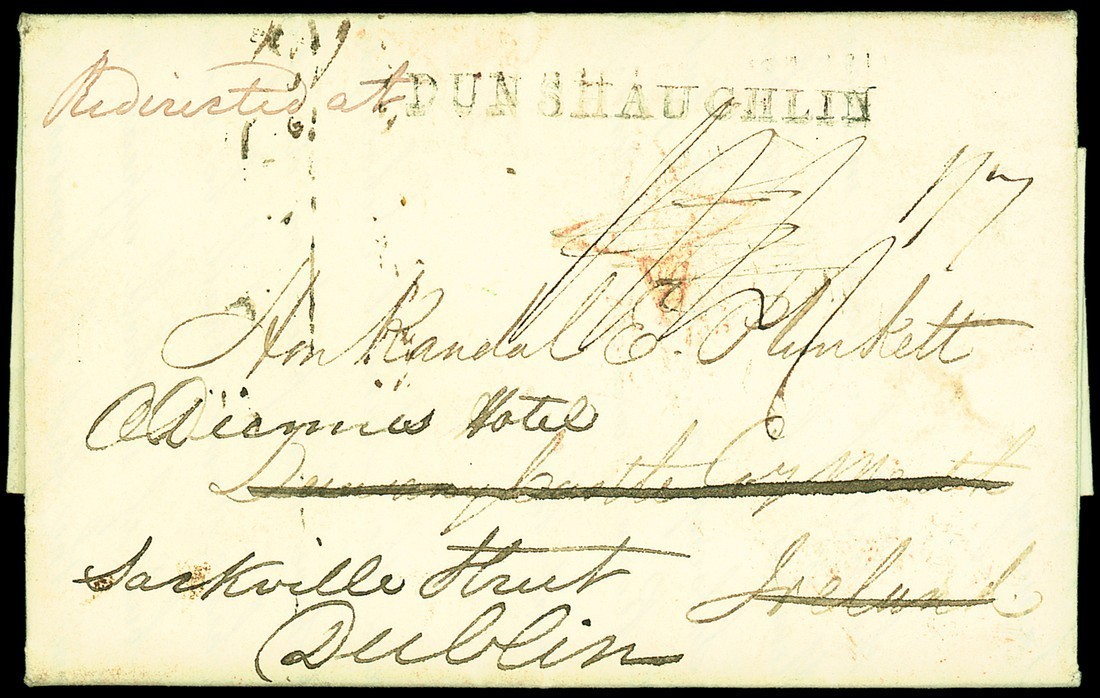 1835 (7 March) entire letter from London to Dunsany Castle, redirected to Dublin with Redirected at "dunshaughlin" on the front, on reverse red Charing Cross Maltese Cross and arrival markings of 9.3 and 11.3; also 1835 (11 March) printed "Uniformity of Weights and Measures" entire with similar Redirected at "dunshaughlin", both fine and uncreased