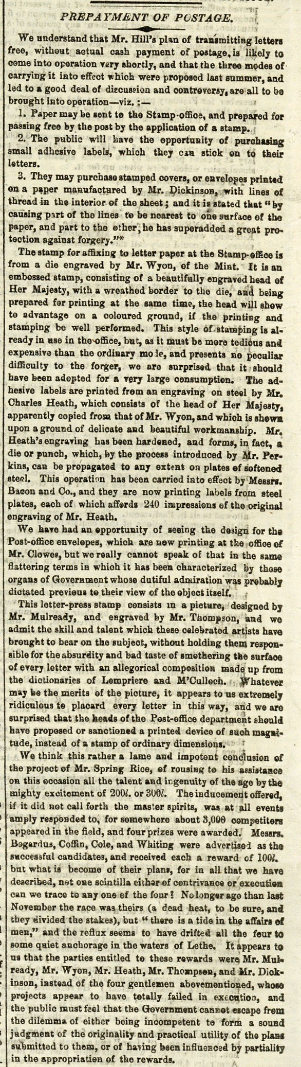 1840 (14 April), "The Times" newspaper, with a lengthy article entitled "prepayment of postage" giving a splendid background history and analysis of the production of the Penny Black and Mulready (which the editor sees fit to ridicule). There is criticism of the choice of Treasury competition winners, suggesting partiality was involved; fine and a most important record of the introduction of postage stamps, just over two weeks prior to their issue on 1 May 1840