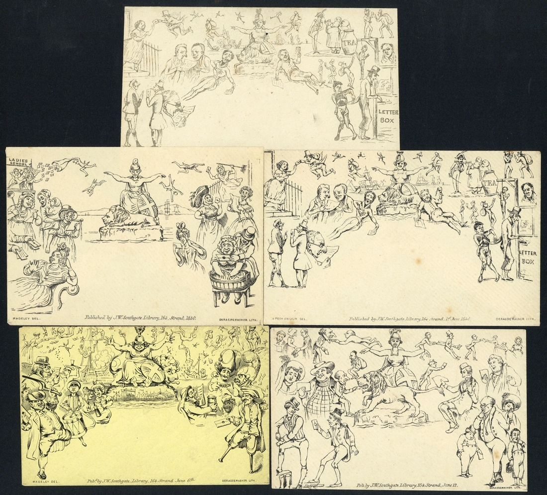 "Pickpocket" envelope number 1; "Ladies School" envelope number 2; "Peg Leg Sailor" envelope number 3 (on yellow); "Pickwick" envelope number 5, Deraedemaeker reprints, some minor stains, also a forgery of the "Pickpocket" numbered 3