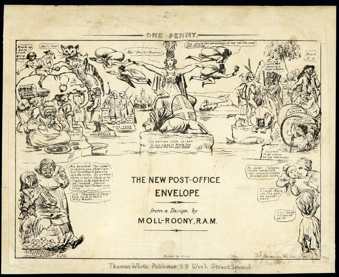 The "Moll-Roony" broadsheet and the smaller envelope, unused, the first a little cut down, the second with manuscript additions to the design; folded and with some faults