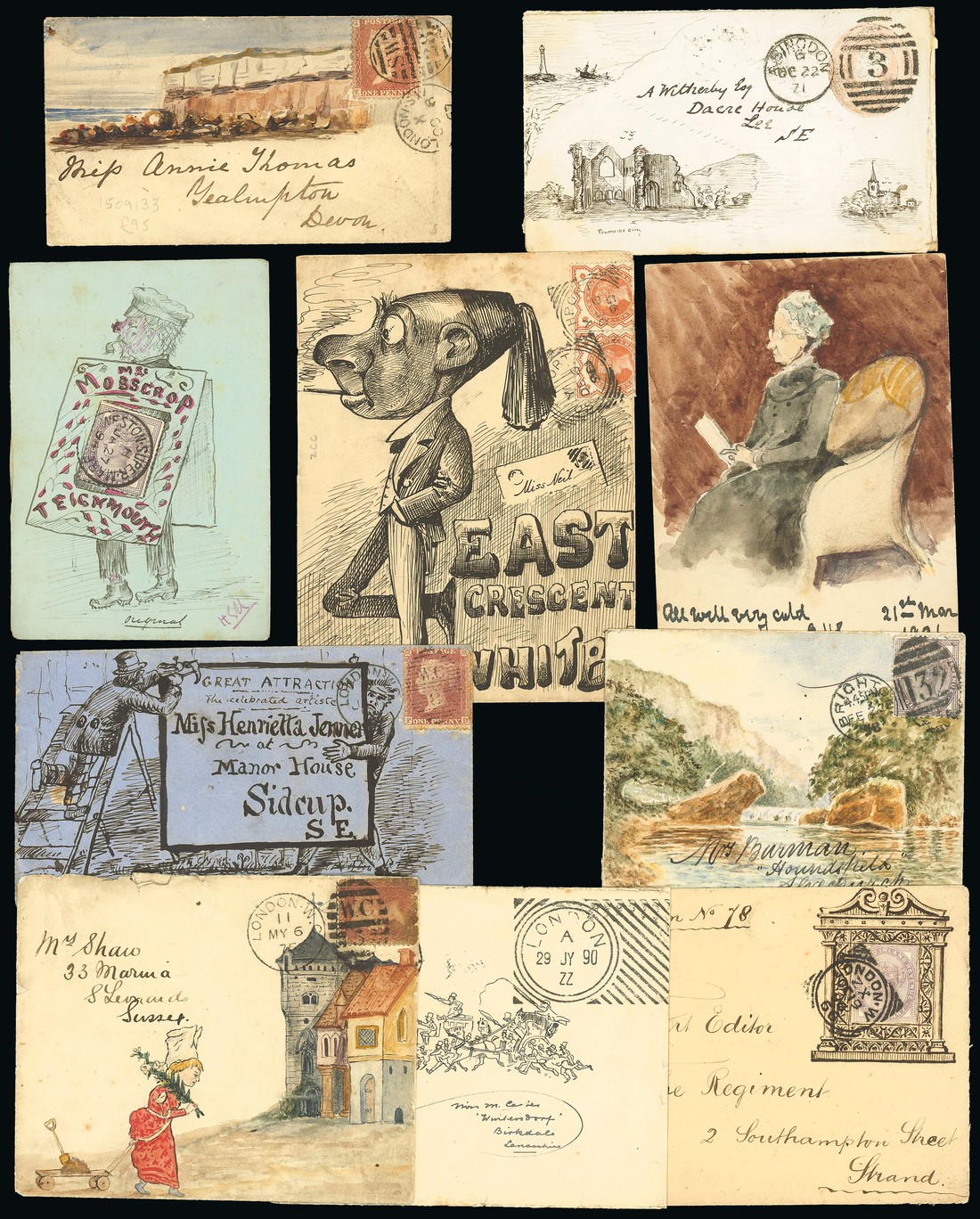 1859-1906 collection of eighty-three hand illustrated envelopes, including thirteen coloured, many themes with animals, birds, humorous, seaside, sport, etc., good to fine. Photo