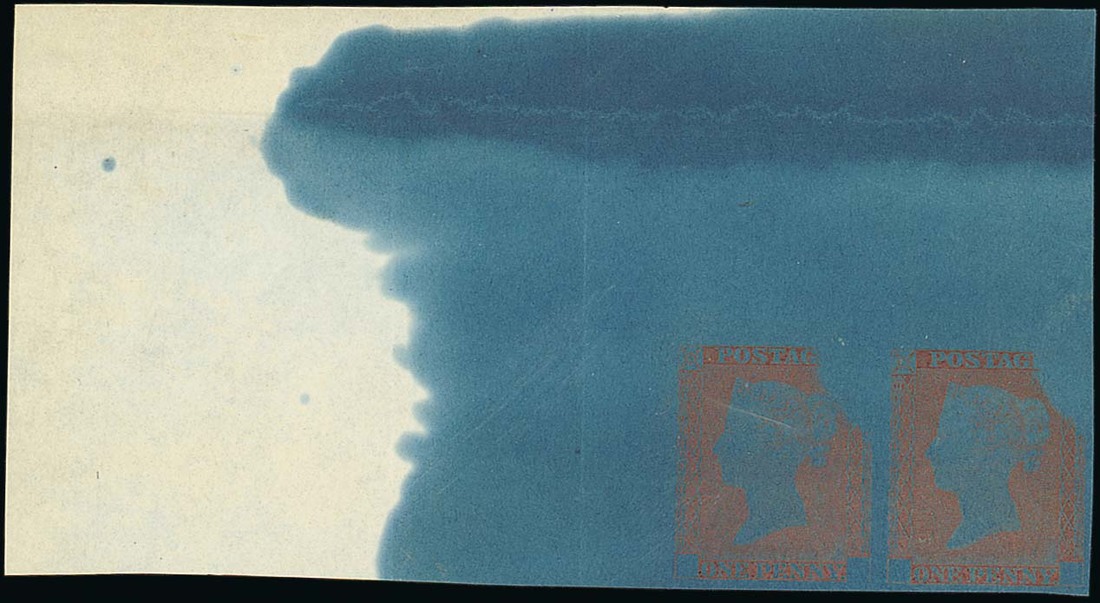 1d. state 3, in red-brown on wove paper dipped in prussiate of potash, [1-2] top left corner pair showing extremely large margins with a significant patch of white paper on the edge of the chemical dipping; some light creasing does not detract from this impressive piece. Specialised DP20a. Photo