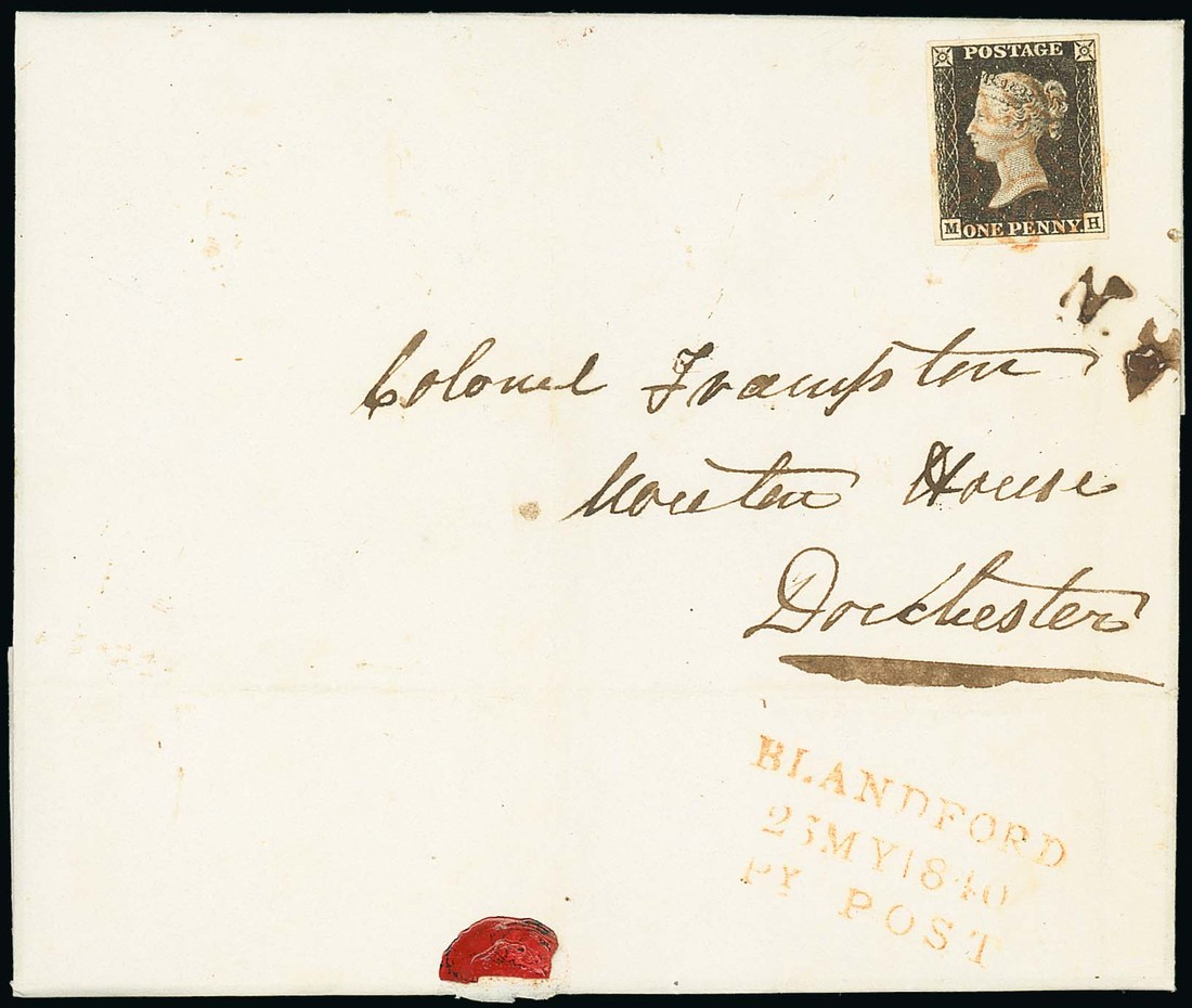 MH, large margins, tied by red Maltese Cross cancellation on entire letter, dated 23 May 1840, to Dorchester, on reverse and opening well for display, fine red "blandford/23 my 1840/py post" marking; light vertical filing bends, one of which just affects the adhesive at right; fine and most attractive. May Date covers with Penny Post markings are very rare. Specialised £2,800+. Photo