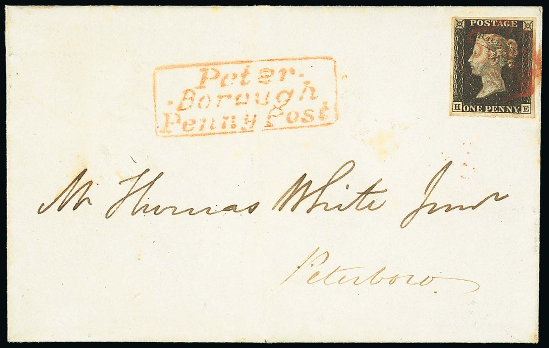 HE, large margins all round, tied by red Maltese Cross cancellation to entire, dated 13 Dec. 1840, addressed to Peterborough, with red framed "Peter/Borough/Penny Post" alongside, dated marking on reverse; light vertical filing fold; fine. A stunning entire of Exhibition quality. Photo