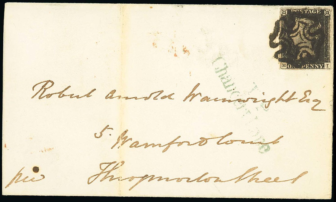 MI (non-coincident re-entry), clear but somewhat uneven margins all round, tied by black Maltese Cross cancellation on entire (side flaps missing), dated 31 Dec. 1840, used within London, blue "T.P./Chancery lane" receiving house marking alongside; vertical filing fold well clear of the adhesive. Fine and scarce experimental usage of the black Maltese Cross. Photo