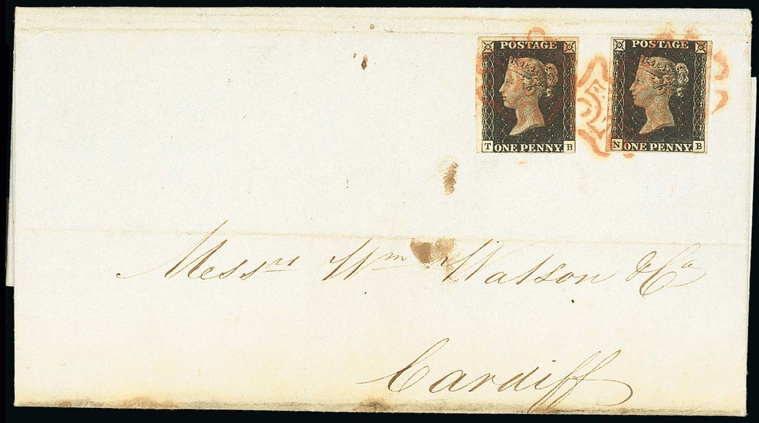 NB and TB, both close to large margins, tied by three red Maltese Cross cancellations, on entire letter, dated 16 July 1840, to Cardiff, Lombard St. Maltese Cross datestamp on reverse; horizontal filing folds clear of the adhesives, fine. Photo