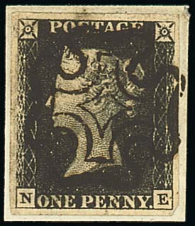 NE, retouched check letters, good to large margins all round, tied to small piece by a fine upright strike of the thin lined Maltese Cross in black. A most attractive example. Photo