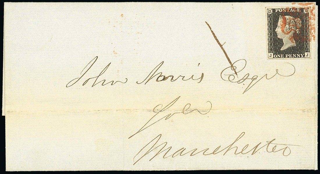 JJ (without ray flaw) large balanced margins all round, tied by a red Maltese Cross cancellation which leaves the Queen's profile untouched, on entire, dated 9 June 1840, from Blackburn to Manchester, dated marking on reverse; horizontal filing fold well clear of the adhesive (which has been lifted for examination and replaced), fine. Photo