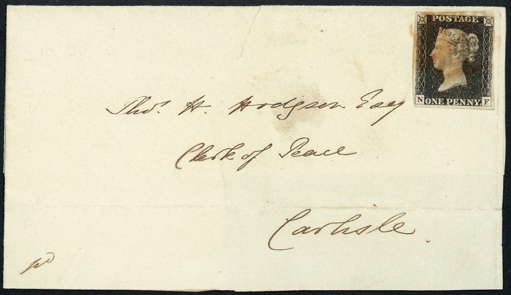 NF, good to large margins all round, tied by red Maltese Cross cancellation, on front, dated 19 July 1840, to Carlisle, Penrith datestamp on reverse; filing fold and sealed tear well clear of the adhesive