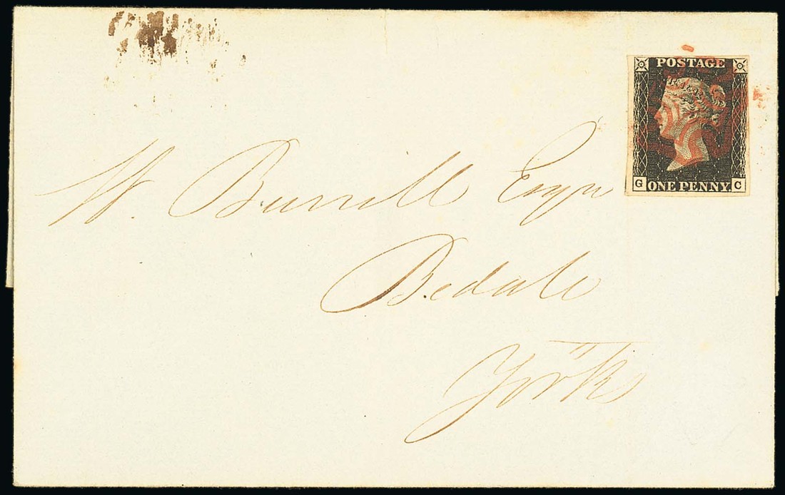 GC, good to very large margins all round and showing a trace of the adjoining stamp at left, tied by red Maltese Cross cancellation, on entire, dated 24 Sept. 1840, to Bedale, on reverse black Lombard St. Maltese Cross datestamp; vertical filing fold clear of the adhesive, fine. Photo