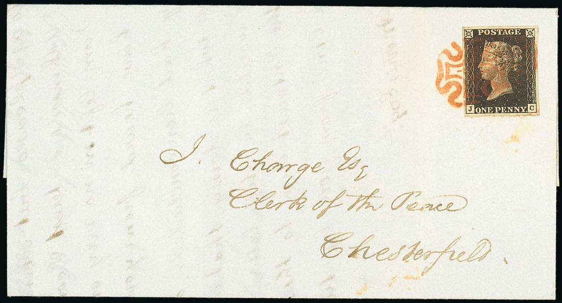 JC, good to large margins all round and showing a trace of the adjoining stamp at right, tied by two upright strikes of the red Maltese Cross (contrary to regulations), to entire letter, dated 19 Feb. 1841, from Derry to Chesterfield, dated marking on reverse; light filing folds clear of the adhesive, showing late use of the Maltese Cross in red. Fine and appealing Photo