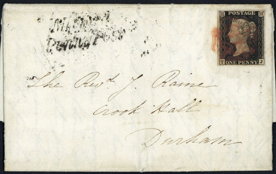 TJ, close to large margins all round, tied by red Maltese Cross cancellation, on mourning entire letter, dated 21 Jan. 1841, to Durham, slightly unclear "Mitcham/Penny Post" receiving house marking on the front and blue Morpeth double ring d.s. on reverse; the adhesive a little stained