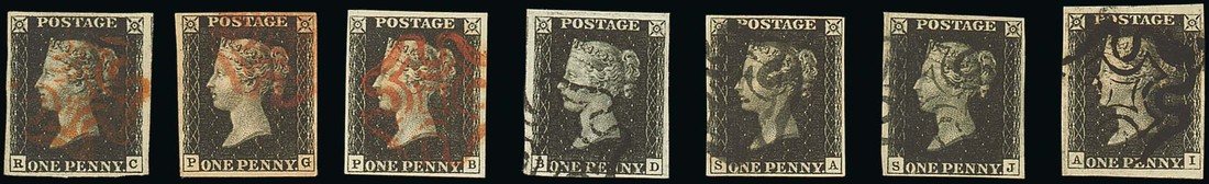Set of Plate numbers 1a, 1b-11 (Plates 1b and 9 matched in red), Plates 8-11 with black, the others with red Maltese Cross cancellations, good to very large margins all round. An exceptional set. Photo