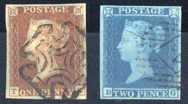 Plate 9: TE, in a deep shade with large margins all round and a full and neat strike of black Maltese Cross cancellation. Also 2d. blue, plate 3, DG on evenly blued paper, good to large, even margins and a light and part strike of 1844-type numeral cancellation. Both very fine and attractive