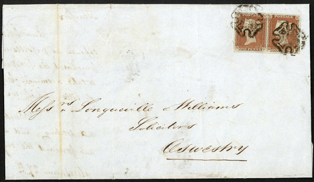 Plate 37: ND-NE horizontal pair, large margins all round, tied by black Maltese Cross cancellation to entire letter, dated 28 May 1844, from Wrexham to Oswestry, dated marking on reverse; filing folds clear of the adhesives and refolded, fine and late use of the Maltese Cross