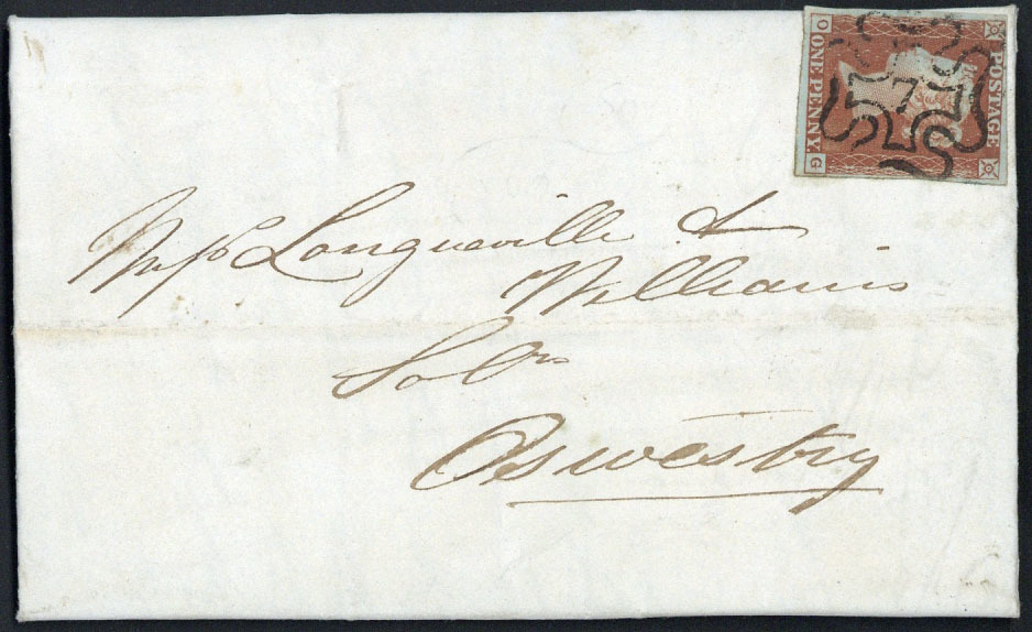 Plate 40 (?): OG, close to large margins all round, unusually placed sideways, on entire letter, dated 18 April 1844, addressed to Oswestry, upright number "7" in Maltese Cross cancellation, dated markings on reverse; light horizontal filing fold clear of the adhesive, fine. Specialised £450