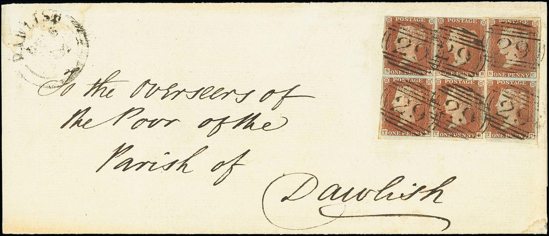 Plate 46: SA-TC block of six (3 x 2), good to huge margins all round, tied by superb "29" barred oval cancellations of Ashburton, to entire letter (no side flaps), dated 4 Dec. 1844, to Dawlish, dated markings on front and reverse; a trifle soiled, fine and with interesting contents regarding poor law relief. Rare and spectacular. Photo