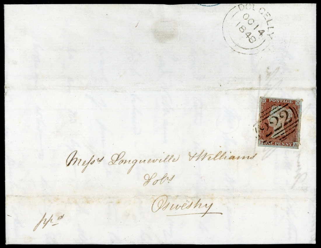 A group of five fine examples on separate entire letters to the same address in Oswestry, all with Welsh numeral cancellations, including "108" of Carnarvon, dated 21 May 1844 (first Month of use), "222" of Dolgelly, "241" of Denbigh, "632" of Pwllhely, etc., close to large margins, fine