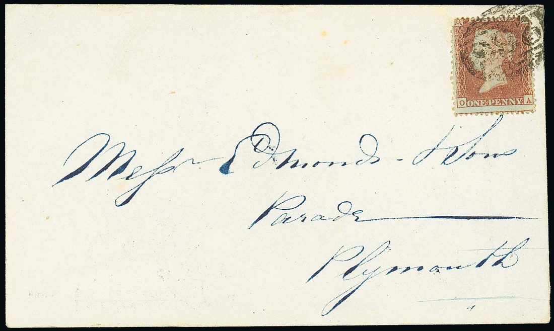 OA, centred to top and with slightly rounded corners at top, tied by "286" barred oval cancellation of Exmouth to envelope dated 27 Dec. 1850, to Plymouth and with dated markings on reverse; attractive and exceptionally early use. Specialised CE2, £2,600. Photo