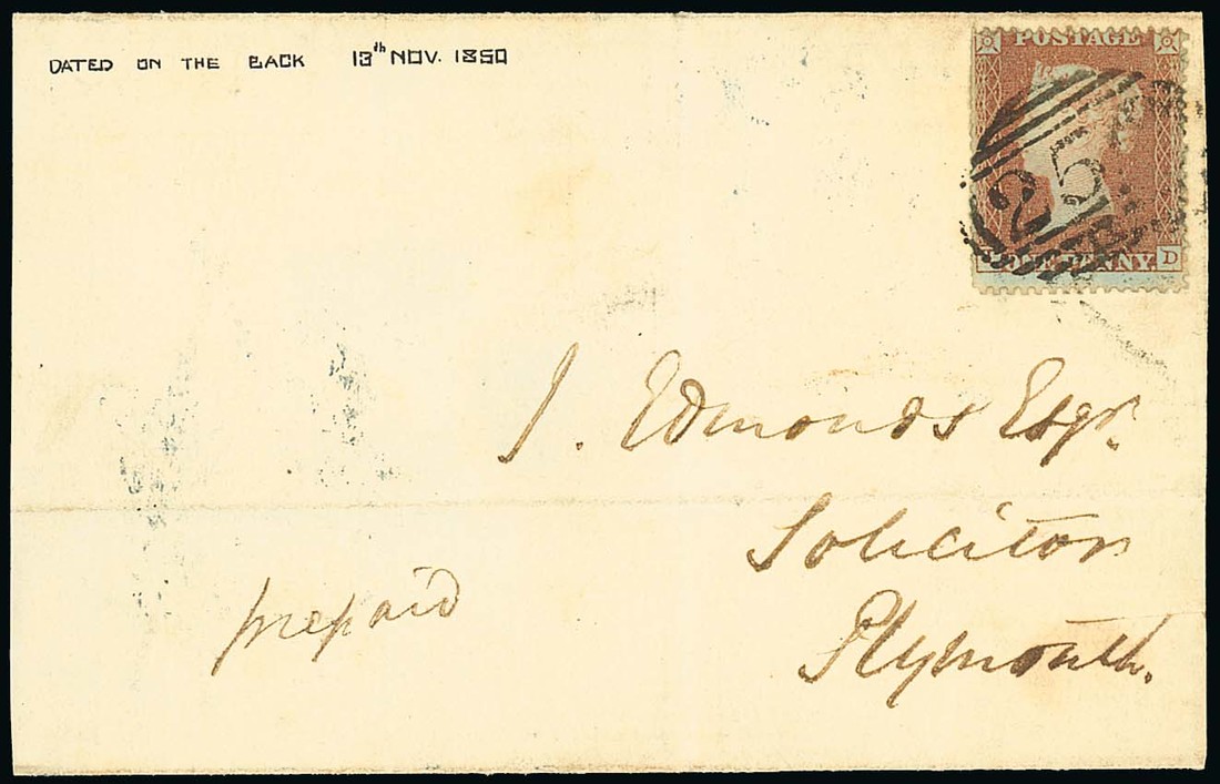 TD, tied by "250" barred oval cancellation of Devonport on wrapper (side flaps missing) dated 13 Nov. 1850, to Plymouth with dated markings on reverse, some short perfs. at left, filing fold clear of the adhesive and a little soiled. Extremely early use. Specialised. CE2, £2,600. Photo