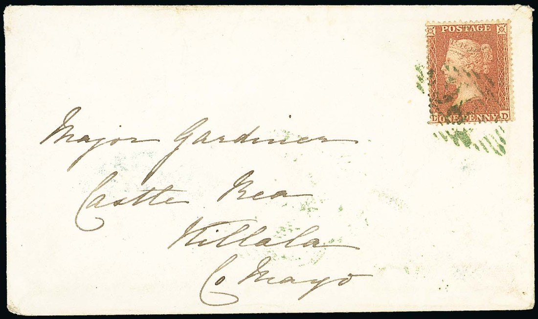 1d., tied to envelope, dated 13 Aug. 1855, to Co. Mayo by green "186" in diamond of bars cancellation of Dublin, on reverse matching d.s.; very fine and uncreased. Rare. Specialised £1,500. Photo