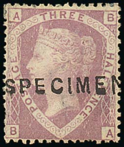 1860 prepared for use but not issued 1½d. rosy mauve, Plate 1, BA, overprinted "specimen" type 2, unused without gum, a few short perfs.; good appearance. S.G. 53as, £2,200. Photo