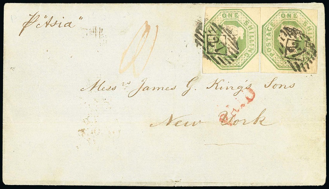 1/- green, two cut square examples with margins practically all round, tied by London inland "27" cancellations, on entire letter, endorsed Pr Asia, dated 26 Oct. 1855, to New York, red curved "paid" on the front and Lombard St. Maltese Cross datestamp on reverse; horizontal filing fold well clear of the adhesives, a trifle soiled, fine. Photo