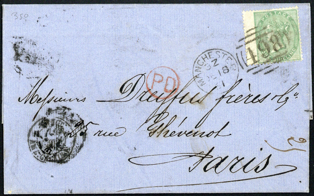 1/- green with wing margin at left, tied by "498" duplex cancellation of Manchester, to entire, dated 12 Dec. 1861, to Paris, red "p.d." in circle, transit and arrival markings on reverse; fine. S.G. 72