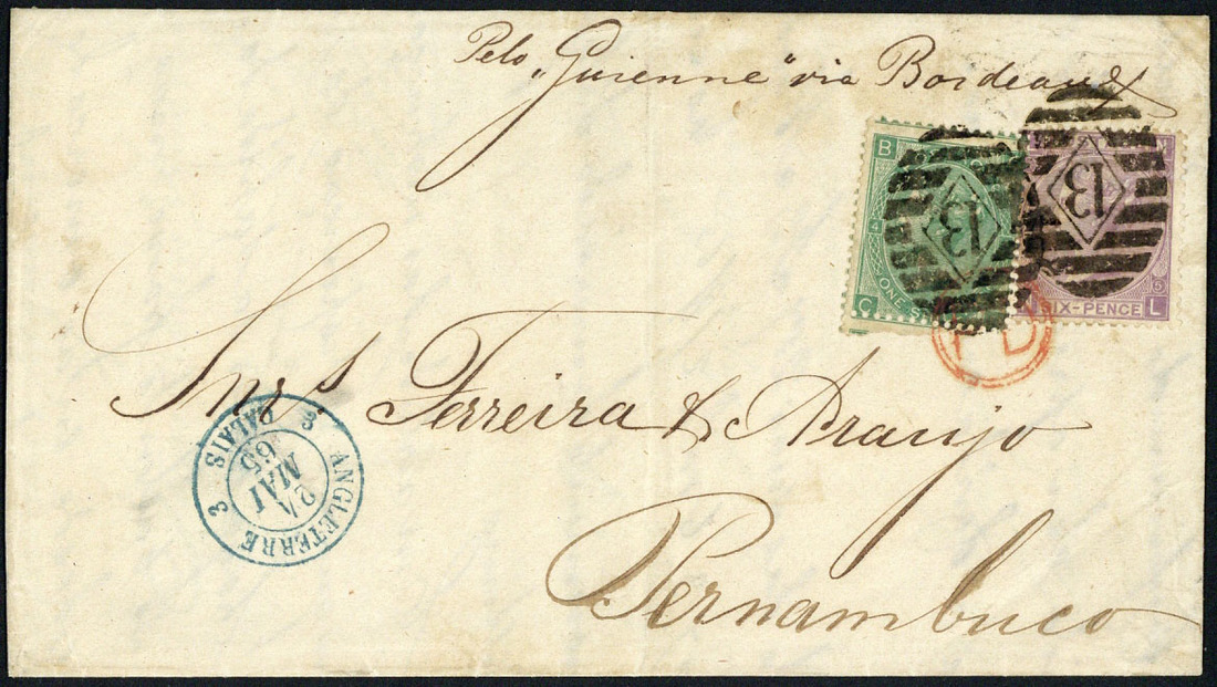 6d. Plate 5, NL and 1/- Plate 4, CB. tied by London Inland section "13" in barred oval cancellations to entire letter, dated 24 May 1865, to Pernambuco, both stamps additionally tied by red double ring "pd" handstamp and with blue "angleterre/calais" d.s. at lower left; very striking. S.G. 97, 101
