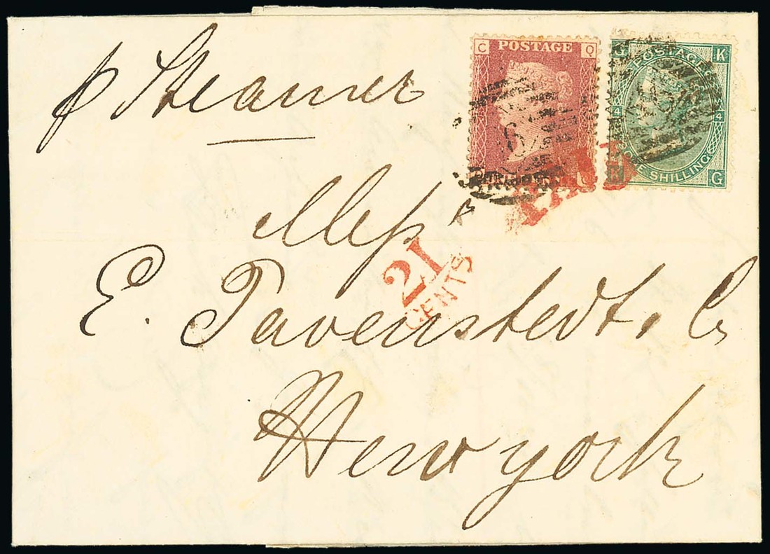 1/- green, Plate 4: KG, used with 1858-79 1d. Plate 87, QC, on entire letter, dated 29 May 1866, addressed to New York, London district "46" cancellations and both stamps additionally tied by red "paid" with "21/cents" in the same colour alongside; spectacular and scarce. S.G. 48/49, 101. Photo