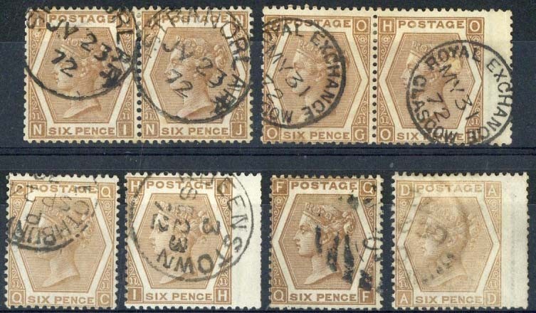 6d. chestnut (shades), Plate 11, two pairs and four singles, mostly with c.d.s. cancellations, three with wing margins, good to fine. S.G. 123/124, £480