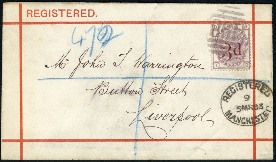 3d. on 3d. lilac, ID, rounded corner at lower right, tied by "498" barred oval of Manchester, to printed registered envelope, dated 5 March 1883, to Liverpool, wax seal on reverse; attractive. S.G. 159 2