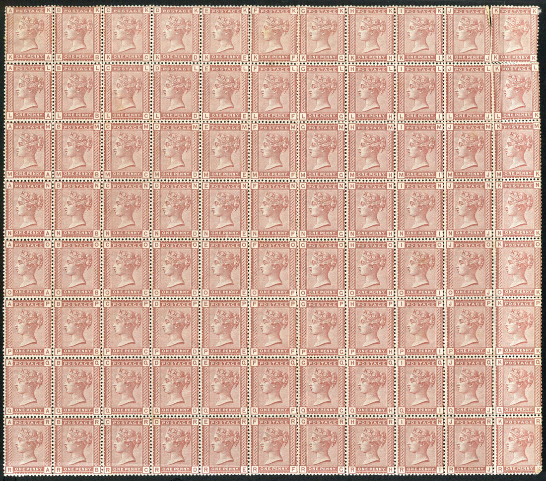 1d. Venetian red, KA-RK, unmounted mint block of eighty-eight; some fox marks, splitting and perforation faults. Fresh appearance. Mostly fair to fine. S.G. 166, £3,080+