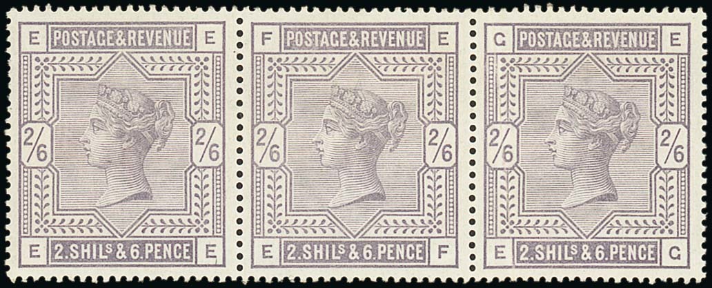2/6d. lilac, EE-EH, horizontal strip of three, original gum, some bends or light creases. fresh and fine appearance. S.G. 178, £1,800+. Photo