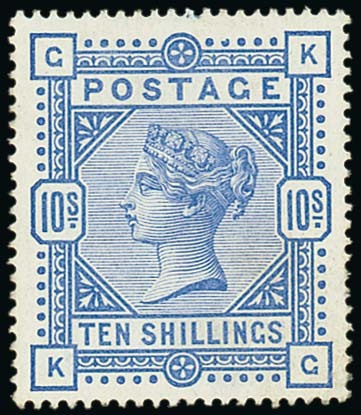 10/- ultramarine, KG, large part original gum; corner crease at lower right; fine. S.G. 183, £2,250. Photo