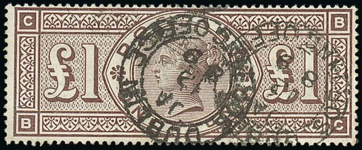 £1 brown-lilac, BC, Dublin Sorting office cancellations of 12 Jan. 1889, fresh colour; small trace of a blue mark on reverse, fine and attractive. S.G. 186, £4,250. Photo