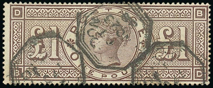 £1 brown-lilac, BD, three octagonal cancellations, creases and a little stained on the reverse, fine appearance. S.G. 186, £4,250. Photo