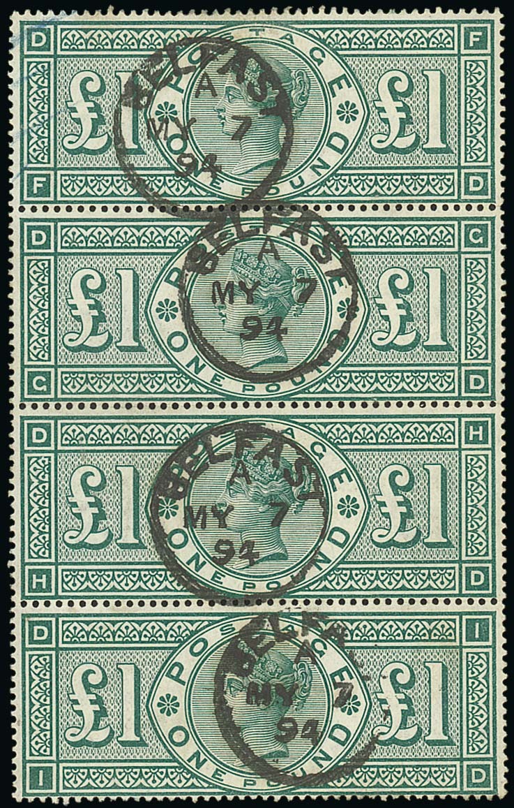FI-ID, vertical strip of four, each with neat Belfast c.d.s. of 7 May 1894; the first with light blue crayon lines at left, fine and a scarce multiple. P.E. (G.B.) Certificate (2002). S.G. 212. Photo