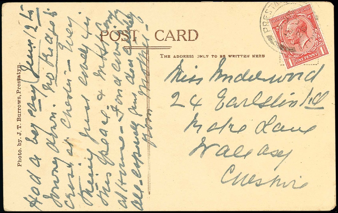 1d. bright scarlet, inverted "q" for "o" variety, tied to p.p.c. (Nant Pool, Prestatyn) dated June 1926; the card creased at lower right. S.G. 357ad, £240+. Photo