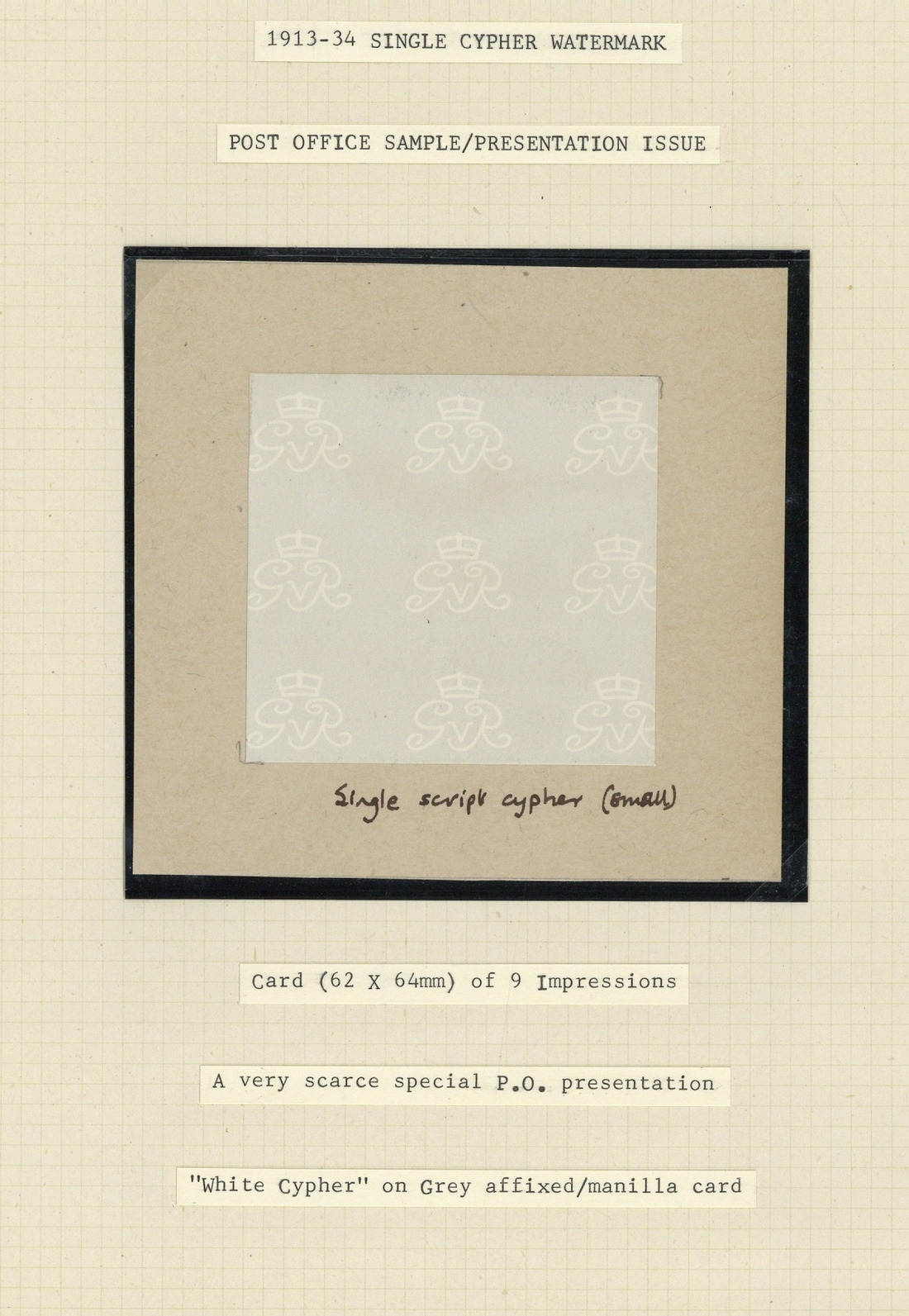 1913-34 Post Office sample presentation sheet bearing nine complete or large part printed examples of the large simple cypher watermark, in white on a grey background, affixed to a Manilla card inscribed "Single script cypher (small)"; most unusual