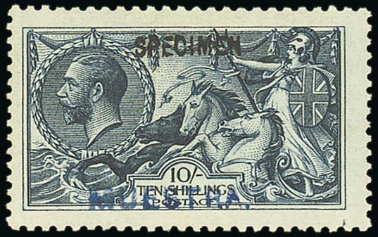 10/- indigo, overprinted "specimen" type 26 and with blue "muestra" from a Spanish receiving authority, mint, small trace of a stain on reverse, not apparent on the face; fine. S.G. 402s, var. Photo