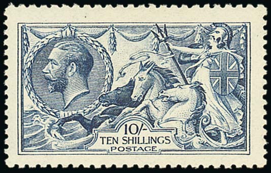 10/- deep blue (worn plate), large part original gum, good colour and perfs., well centred and fine. B.P.A. Certificate (2013). Specialised N70(8), £3,250. Photo