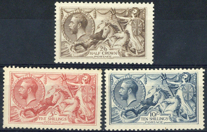 2/6d. olive-brown, 5/- rose-red and 10/- dull grey-blue, part original gum, the 10/- mint, 5/- with short perfs. at left and a trifle stained. S.G. 413a, 416, 417